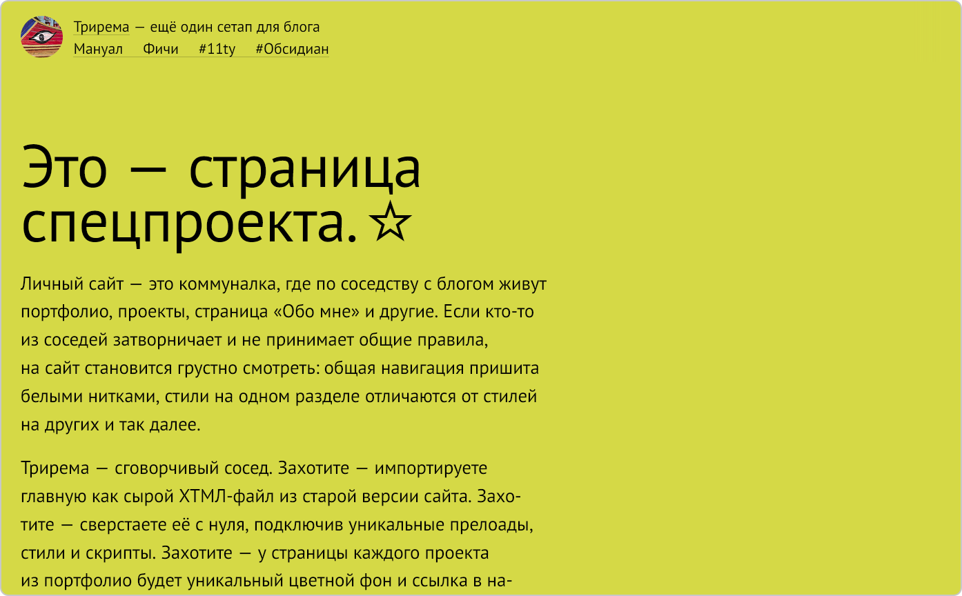 Трирема — сговорчивый сосед. Захотите — импортируете главную как сырой ХТМЛ-файл из старой версии сайта. Захотите — сверстаете её с нуля, подключив уникальные прелоады, стили и скрипты. Захотите — у страницы каждого проекта из портфолио будет уникальный цветной фон и ссылка в навигации по сайту. Захотите — и ваш пост про Гутенберга будет свёрстан плотным блоком фрактуры в центре страницы. Или ПТ Сансом на зелёном фоне без автоматически подставленного заголовка, полоски с тегами и розового сердечка.