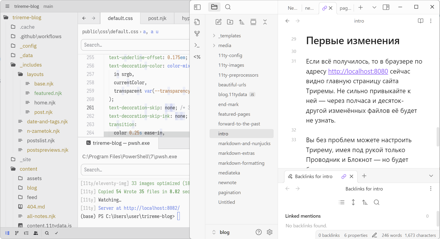 В редакторе кода откройте папку trireme_blog как новый проект, запустите npx @11ty/eleventy --serve в местном Терминале и поехали редактировать файлы
