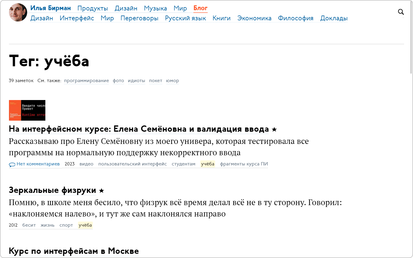 It just felt right: все фичи жизненно необходимы, полосочка с датой и тегами и навигация в одну линию до жути элегантны, соцсеточный кружок-аватарка обязателен. Это не было слепым фанбойством: я делал по-своему всё, насчёт чего у меня было своё артикулированное мнение или предпочтение: ссылки, пагинацию, структуру сайта, отдельные страницы, вся техническая часть. Если же мнения не было и я просто пытался сделать что-то в пику Эгее, я безнадежно проигрывал — тяжело спорить с 20 годами наработок. Особенно от дизайнера, чей стиль тебе нравится.