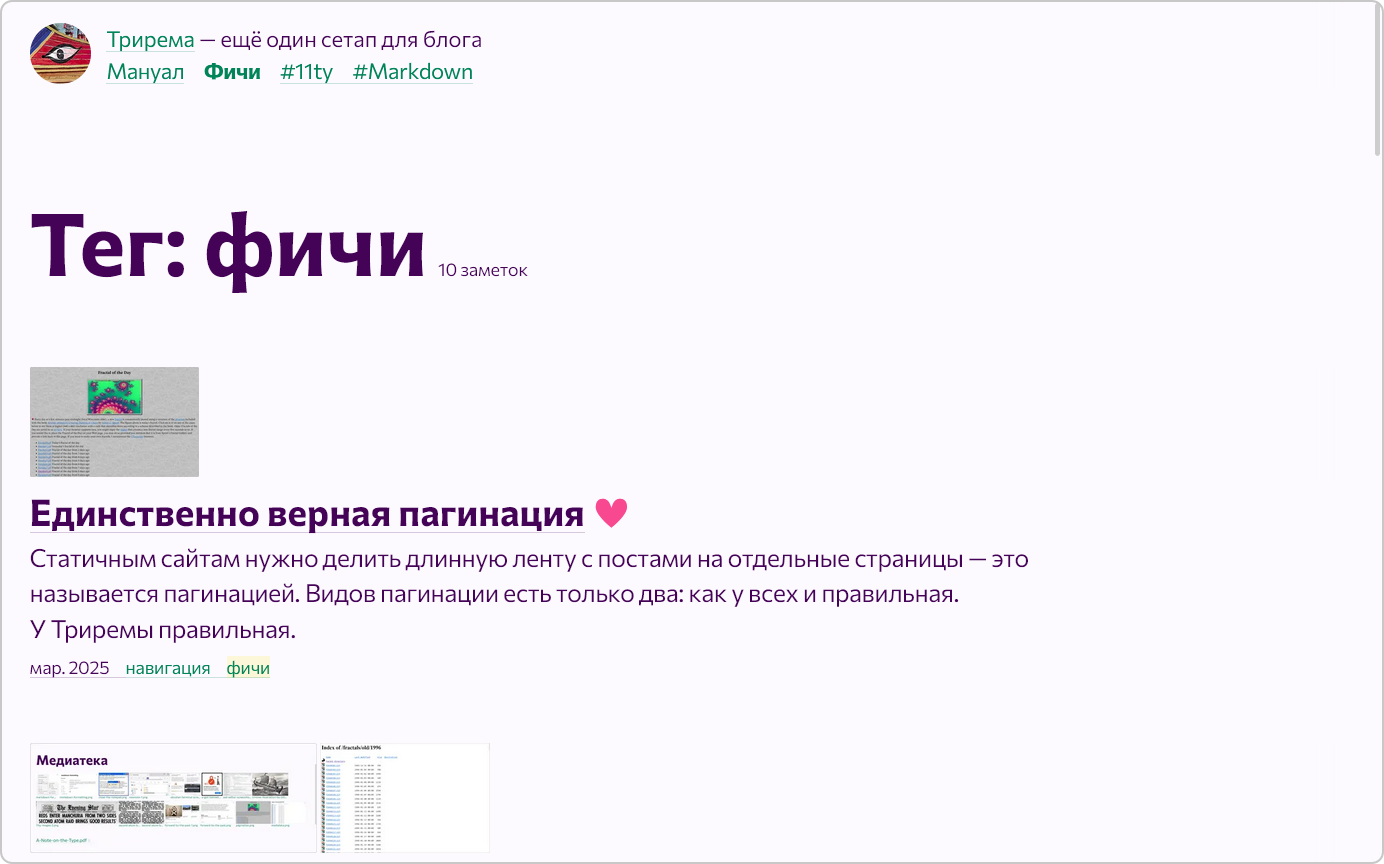 Я всегда считал копирование частью образовательного процесса и роста насмотренности — и Трирема, изначально проект по изучению веб-разработки, многое скопировала у Эгеи, лучшего из известных мне движков для блогов. Копирование, разумеется, не было самоцелью: просто Эгея из-за своей популярности и проработанности для меня превратилась в нативный дизайн блога на русском.