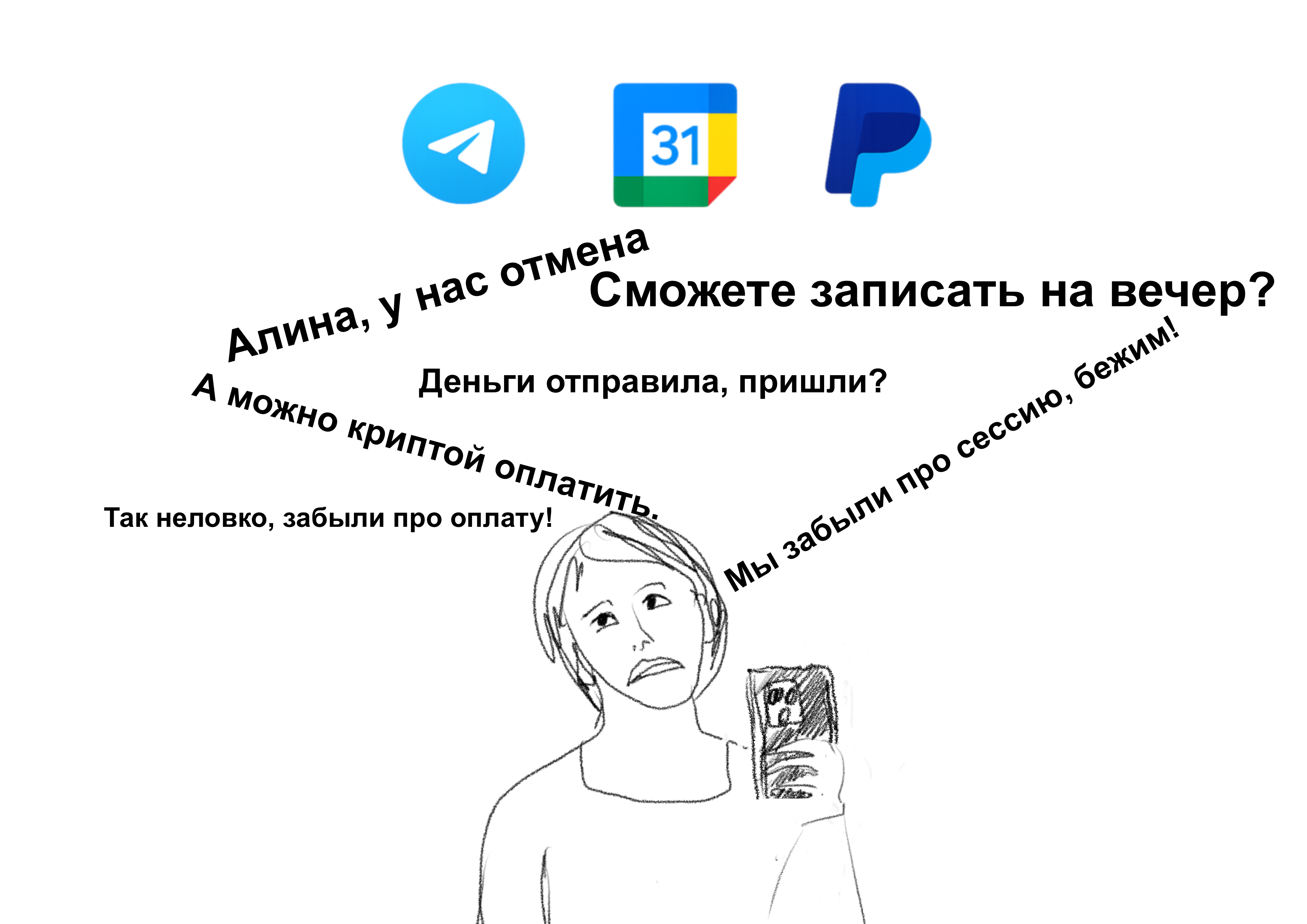 Вместо времени с семьей, я продолжала работать: между сессиями, в выходные, на прогулках и в транспорте, утром и вечером. Оргвопросы не заканчивались: больше клиентов, больше вариантов оплаты, меньше слотов в календаре, больше головной боли 🤯